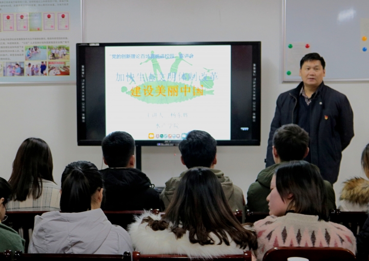 12月12日下午,水产学院开展“党的创新理论百场宣讲进校园”活动,院长杨东辉以“加快生态文明体制改革,建设美丽新中国”为题,为水产学院全体学生党员、入党积极分子、主要学生干部等做报告。 杨东辉院长从环境污染现状和生态文明建设的重要性入手,结合水产行业对生态环境的影响,全面阐述了习近平总书记关于生态文明建设的新思想新理论新战略。生态文明建设是关系中华民族永续发展的根本大计,是“五位一体”总体布局和“四个全面”战略布局的重要内容,要切实贯彻新发展理念,树立绿水青山就是金山银山的强烈意识,努力走向社会主义生态文明新时代。 通过学习,同学们对生态文明建设的新思想新理论新战略有了更全面的认识,纷纷表示要牢固树立社会主义生态文明观,从我做起,从身边的小事做起,尊重自然,热爱自然,保护自然,为生态文明建设贡献水产人的一份力量。(水产学院 晏方舟)