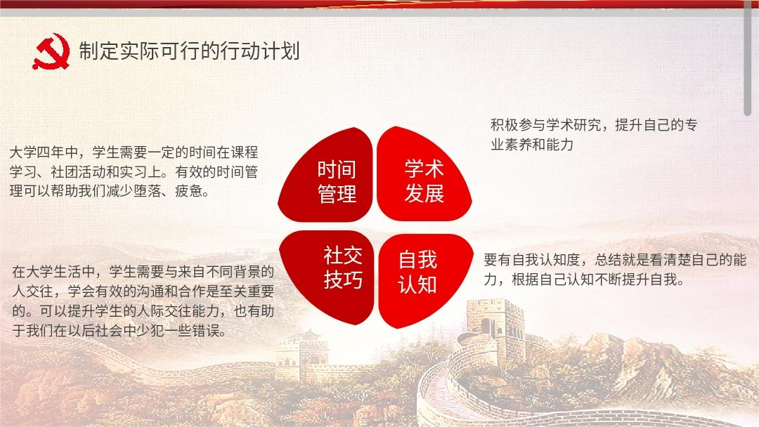 此外还邀请到了潘志成同学,他为大家提供了一份大学生活规划指南,他认为合理规划大学生活至关重要,并且他从设定学业目标、安排学习时间、拓展兴趣爱好、参与实践活动、建立社交圈子、培养自我管理能力以及规划职业发展等多个方面和在场的同学展开了深入交流。