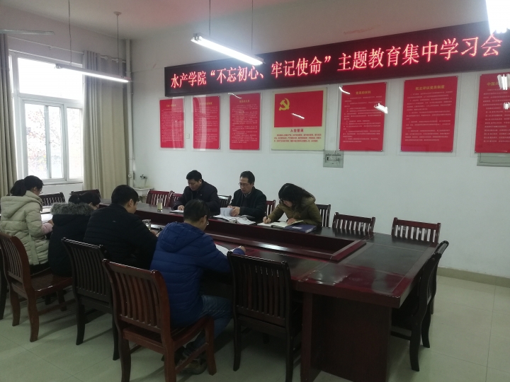 根据学院“不忘初心、牢记使命”主题教育安排,11月27日上午,水产学院党总支在党员活动室召开“不忘初心、牢记使命”主题教育集中学习会。水产学院领导班子、各支部书记参加了会议。会议由水产学院党总支书记郭旭升同志主持。
