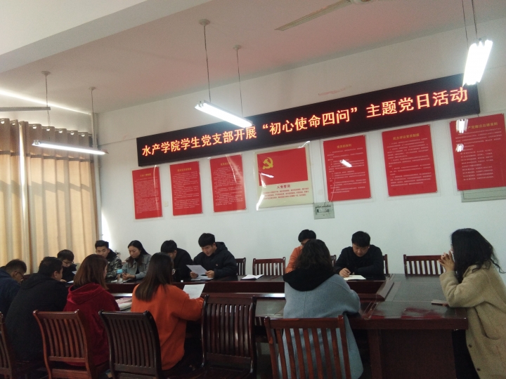 水产学生党支部于2019年11月20日中午,在水产学院会议室2C330举行了以“初心使命四问”为题的党日活动。水产学院副书记黄光玲、学生全体党员、发展对象参加了本次党日活动,会议由学生支部李建玲老师主持。
