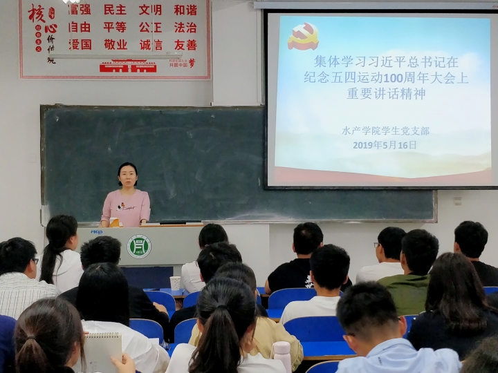 5月16日,水产学院学生党支部在一教A105教室集体学习习近平总书记在纪念五四运动100周年大会上重要讲话精神。学生支部全体党员、积极分子参与了此次学习会。 会上,学生支部书记晏方舟带领学生支部共同学习了习近平总书记在纪念五四运动100周年大会上的重要讲话内容,鼓励同学们在学习和生活中要弘扬五四精神,以习近平总书记对新时代中国青年提出的“六个要求”为标准,严格要求自己,珍惜这个时代、担负时代使命,在担当中历练,在尽责中成长,让青春在新时代改革开放的广阔天地中绽放,让人生在实现中国梦的奋进追逐中展现出勇敢奔跑的英姿,努力成为德智体美劳全面发展的社会主义建设者和接班人!(晏方舟)