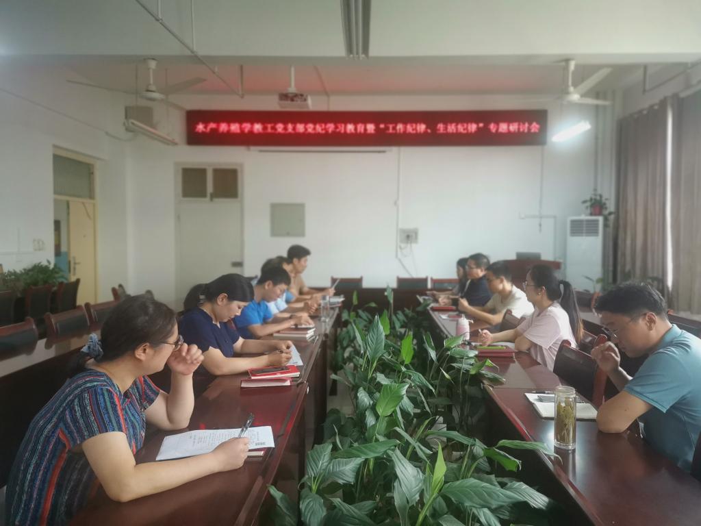 6月25日,水产养殖学教工党支部召开党纪学习教育暨“工作纪律、生活纪律”专题研讨会,会议由水产养殖学教工党支部书记冯德祥同志主持。