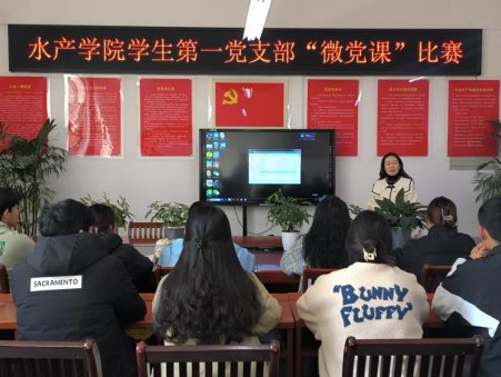 为巩固深化学习贯彻习近平新时代中国特色社会主义思想主题教育成果,扎实开展“基层党组织建设年”活动,进一步提升学生党员教育实效,教育引导学生党员学好新时代理论,讲好新时代故事,按照校党委组织部安排,水产学院学生第一党支部于11月24日在2c330党员活动室开展以“学思践悟新思想,踔厉奋发新时代”为主题的微党课比赛。