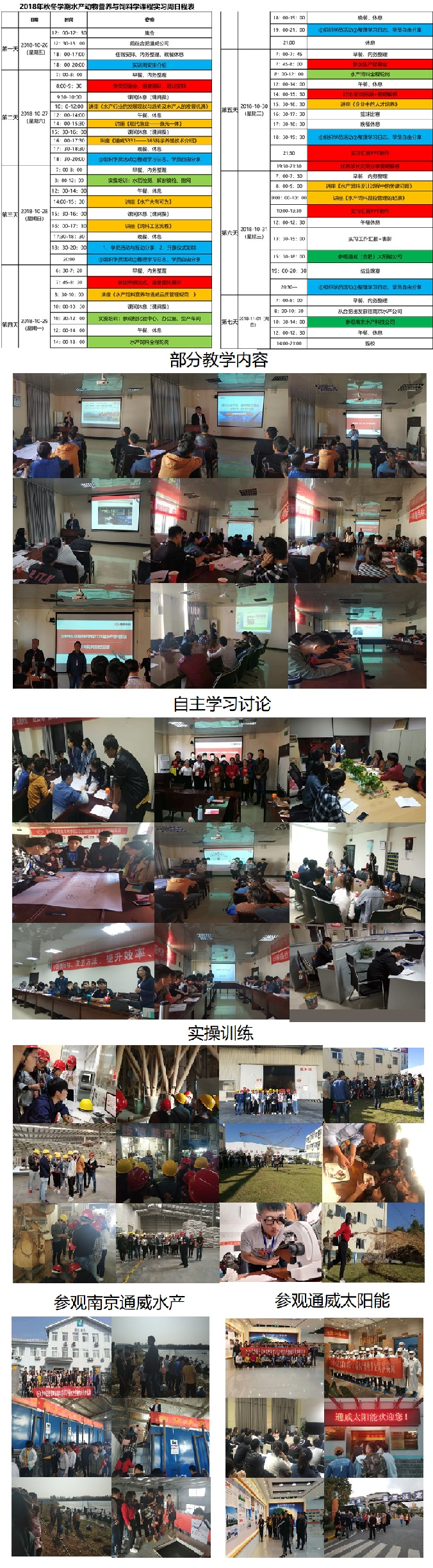 本次实训周,水产学院在对前两次实训教学成果充分总结的基础上,与通威集团华中区充分沟通,根据人才培养和教研需要,重新调整了教学计划。通威集团从华中区多个分公司调配十余名高级专业技术人员配合本教学计划。