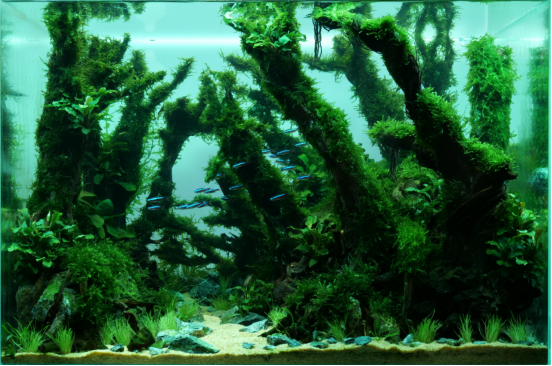 作品创意:森林是最古老,生命力最强的生态景观,我们曾有幸见过大别山、鸡公山和波尔登森林里面的古老巨树,巨树的生命力深深震撼到了我们,我们想在水下还原出包罗万象,具有无穷生命力的巨树之森。景观采用三分法,运用了黄金比例和凹形构图相结合,采用深绿色的水草和少量红色水草点缀,展现出翠绿碧透的效果,凸显出森林景观的幽暗深邃。