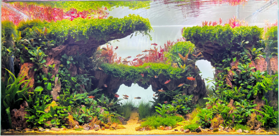 作品创意:生活中城市中的我们,往往对于自然山野有着发自内心的向往,我们用可塑性强的松皮石来构建山体,在山上种植爬地矮珍珠等水草,使其在生长中自然下垂。同时,山野不止有平原旷野,也有曲径通幽,别有洞天。强劲有利的山体拔地而起,再配合红色水草做延伸,借此展现出富有生命力的旷野山原。