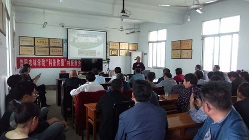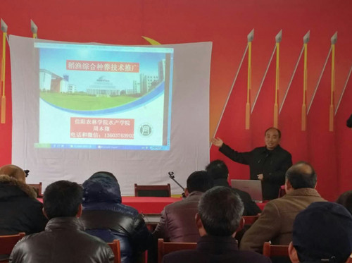 2018年3月20日,在学校科技处副处长史洪中教授的带领下,水产学院专业教师周本翔等前往光山县十里镇姚寨村,在村会议室为该村贫困户等30人培训了稻田养殖小龙虾技术和水稻生物防治病虫害技术。4月1日,水产学院专业教师周本翔、伦峰等前往光山县罗陈乡,在乡会议室为全乡稻田养殖小龙虾示范户和贫困户50多人培训了稻虾(小龙虾)共作技术。