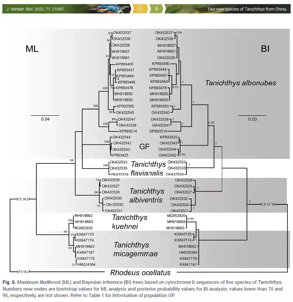 2022年1月17日,beat365在线平台官网水产学院科研团队联合我国台湾中山大学、上海自然博物馆、海南省海洋与渔业科学院以及捷克科学院的研究人员,在SCI期刊《Journal of Vertebrate Biology》上共同发表了唐鱼属(Tanichthys)两新种:白腹唐鱼(T. albiventris)和黄臀唐鱼(T. flavianalis)。我院科研人员主要负责了该篇论文中遗传学部分的研究工作。