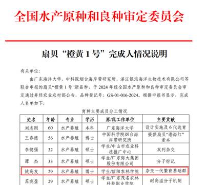 日前,广东海洋大学牵头联合相关单位申报的扇贝“橙黄1号”新品种,顺利通过全国水产原种和良种审定委员会审定,并获得农业农村部公告认证,品种登记号为GS-01-016-2024。我院教师姚高友博士作为主要参与人,在该品种杂交一代繁育基础群的构建工作中作出了重要贡献。新品种是水产业持续健康发展的重要基石,我院将继续秉持攻坚克难的精神,力争在水产新品种创制方面实现更多突破。(撰稿/姚高友 初审/田媛 审核/吴坤杰 终审/郭旭升)
