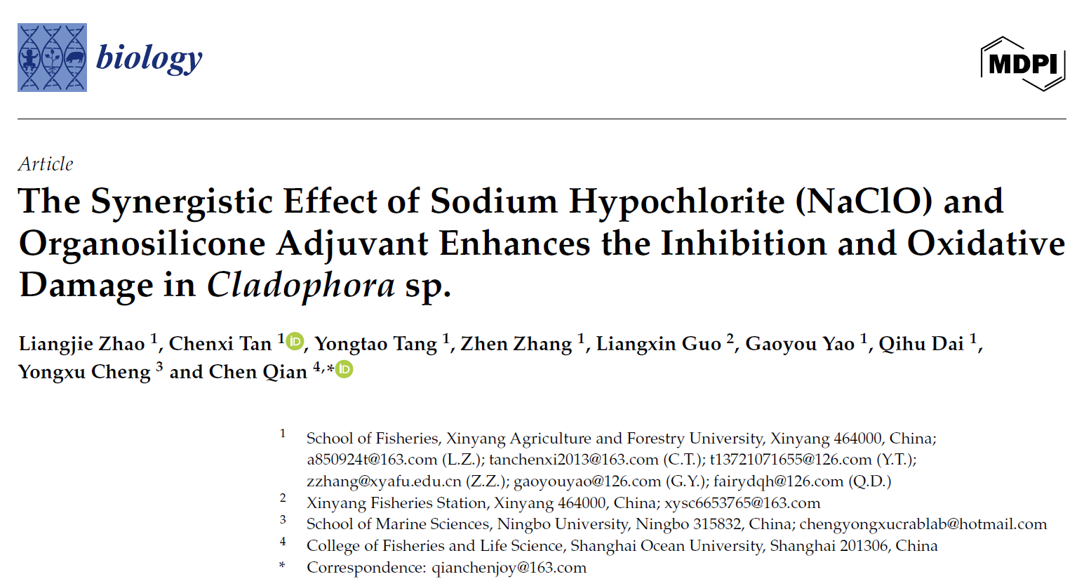近日,由beat365在线平台官网、宁波大学、上海海洋大学等机构联合组成的科研团队在国际知名期刊《biology》(中科院二区)上发表题为“The Synergistic Effect of Sodium Hypochlorite (NaClO) and Organosilicone Adjuvant Enhances the Inhibition and Oxidative Damage in Cladophora sp.”的研究论文。刚毛藻作为常见的丝状绿藻,在水体富营养化条件下极易形成大规模藻华,严重破坏水生生态系统平衡,并对水产养殖业构成持续威胁,当前防控手段多依赖高剂量化学药剂,存在效率低、环境风险高等问题。该研究首次揭示低剂量有机硅助剂可显著增强次氯酸钠(NaClO)对刚毛藻(Cladophorasp.)的抑制效果,为淡水丝状藻类水华的绿色防控提供了高效、低耗的新途径。
