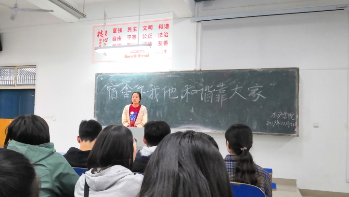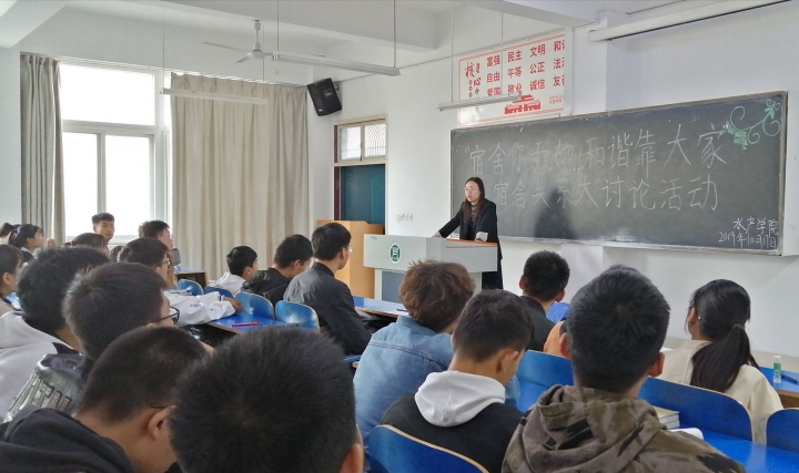 为建立和谐宿舍,共创文明校园。10月15日-18日水产学院各年级辅导员开展了“宿舍你我她,和谐靠大家”主题班会,各班级辅导员分别在一教A205和A105等教室开展了班会。