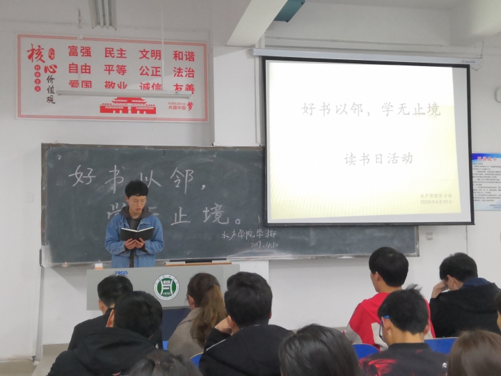 在4月23日“世界读书日”到来之际,为使大学生养成良好的阅读习惯,帮助大学生提高人文素养,使大学生自觉践行习近平新时代中国特色社会主义思想,4月10日晚6点50,水产学院在1教A105举办了“与书香久别重逢”读书月系列活动。参加此次活动的评委有水产学院辅导员李建玲及学生会干部,本次的比赛由18级原嘉城、孙俊同学主持,18级全体学生参加此次演讲比赛。