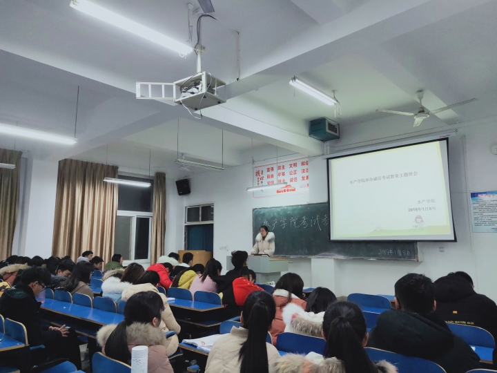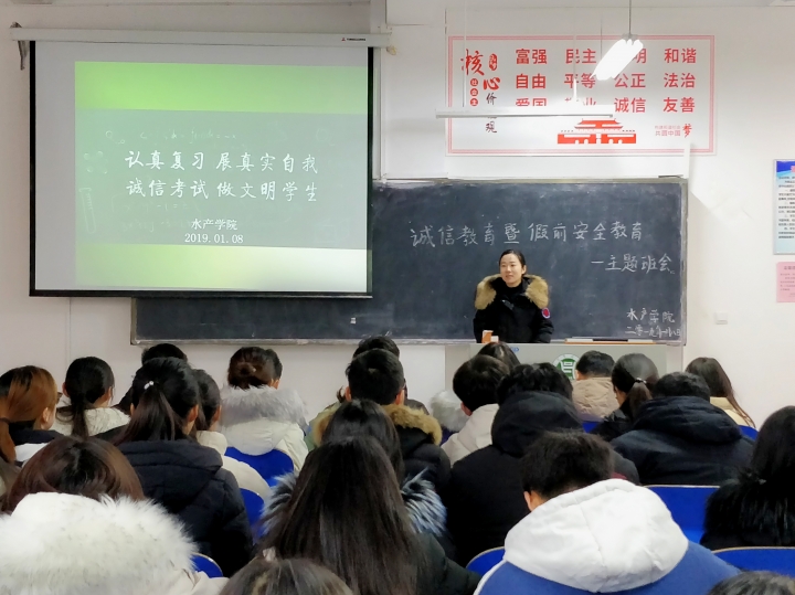 近日,水产学院各班陆续召开期末诚信考试暨假期安全教育主题班会。会上,辅导员老师根据学校要求,结合《beat365在线平台官网学生工作制度汇编》相关规定,要求同学们认真备考、杜绝作弊,并说明作弊的危害后果,引导同学们诚信考试。 假期安全教育方面,辅导员对人身安全、财产安全、交通安全、宿舍安全以及假期出行、打工等进行了讲解,要求同学们提高安全意识,远离安全隐患。假期不组织或参与外出打工;回家乘坐正规渠道车辆,最好结伴而行,并随时将行程告诉父母;离校前关好门窗、水、电,贵重物品不要留在寝室;假期里自觉远离传销陷阱、邪教组织。同时对下学期返校事宜进行了相关安排布置,提醒学生合理规划时间,按时返校。此外,老师鼓励同学们在寒假期间阅读有益书籍,积累知识,开阔眼界。(晏方舟)