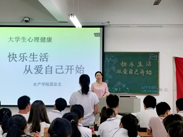 5月25日上午,水产学院各班召开“快乐生活从爱自己开始”主题心理健康班会。5.25是大学生心理健康日,谐音是“我爱我”,意为关爱自我的心理成长和健康。水产学院本次心理健康班会的主题是“快乐生活从爱自己开始”,让同学们通过讨论“什么是爱自己、为什么爱自己、怎样爱自己”等话题,引导同学们正确认识爱自己的内涵,正确认识心理健康的对大学生成长的重要性,真正做到认识自我,接纳自我,体验自己存在的价值,乐观自信,用信任、友爱、宽容、尊重的态度与人相处,收获友谊和成长。(晏方舟)