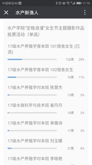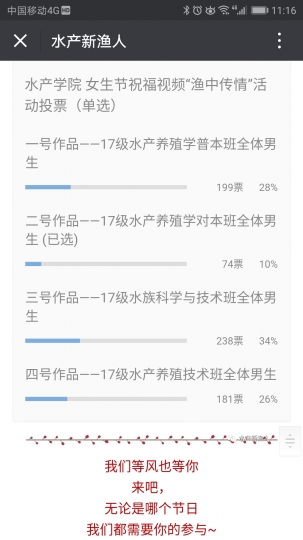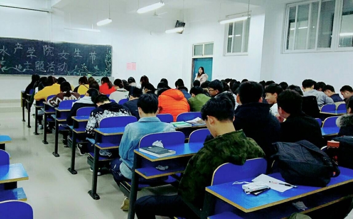 班会上女生们对如何提高女生形象、气质,如何做新时代女大学生、阅读的重要性等话题畅所欲言,表达了自己作为一名女生的自信和追求。在足球场上开展的户外联欢会,大家载歌载舞,欢声笑语,既展示了自己的文艺才华,又增进了同学间的交流与友谊。男生们为各班女生录制的祝福视频和女生拍摄的主题照片,分别在水产学院学生工作微信公众号“水产新渔人”上进行展示和投票,同学们积极参与、精心制作,引起了热烈的反响。学工组黄光玲、晏方舟老师为得票靠前的班级和同学颁发了学院自制的特色奖品——微观生态缸和生态瓶,以及一些生活用品,受到了大家的欢迎。(晏方舟)