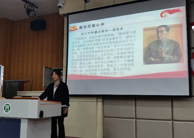 参赛学生详细介绍了战火纷飞的年代,革命先辈为保家卫国做出的牺牲,先辈们的人格魅力深深吸引着同学们。通过故事,同学们学习到周恩来总理两袖清风,为国家用好每一分钱的节俭清廉品德;梁慧贞为母则刚而又坚守党的秘密的坚强品质;王海萍宁折不弯的顽强意志。特别是周恩来总理关心人民、外交活动妙语连珠、和夫人相濡以沫、以古玩掩护地下工作等小故事,加深了同学们对周总理的认识。以英雄群象的形式展开一幅有关党历史的光辉画卷,将红色人物故事形象穿插进党的历史中,贯穿前后,向同学们阐释了党所存在的意义和党组织的重要性。