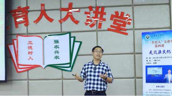 为全面贯彻落实立德树人根本任务,深入推进“三全育人”工作,引领学生以强农兴农为己任,beat365在线平台官网“三全育人”大讲堂第四讲“走近渔文化”于10月15日下午在一教E101举行。主讲人水产学院副院长伦峰为全校师生带来了一场精彩的讲座,校党委宣传部副部长徐大伟、校党委学工部副部长孙莉琴、旅游管理学院党总支副书记杜丽、食品学院党总支副书记刘涛和beat365在线平台官网部分师生线下参加了讲座。讲座由水产学院学院党总支副书记黄光玲主持。