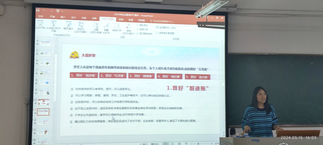 首先李建玲老师结合beat365在线平台官网学生实际情况对征兵工作进行了解读,她通过国防和军队现代化建设成就以此来激励广大适龄学生,增强参军入伍的光荣感和自豪感。其次李建玲老师给我院学生强调了相关政策法规,像《兵役法》《征兵工作条例》,着重强调了《信阳市大学毕业生入伍六条政策》《大学生入伍17项优惠政策》、“两征两退”等政策法规,使我院学生充分了解征兵政策的新变化、新调整和有关优抚政策,发挥优抚政策的激励作用,激发我院适龄学生的拥军爱军参军热情,增强社会责任感与使命感。