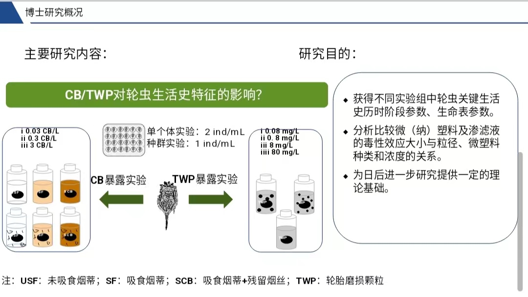 然后她介绍了自己在硕博阶段的学习经历。在硕士阶段主要是对六溴环十二烷对褶皱臂尾轮虫的生殖毒性效及其作用机制开展了初步研究;在博士期间开展了CB/TWP(烟蒂/轮胎磨损颗粒)对轮虫生活史特征的影响相关研究。