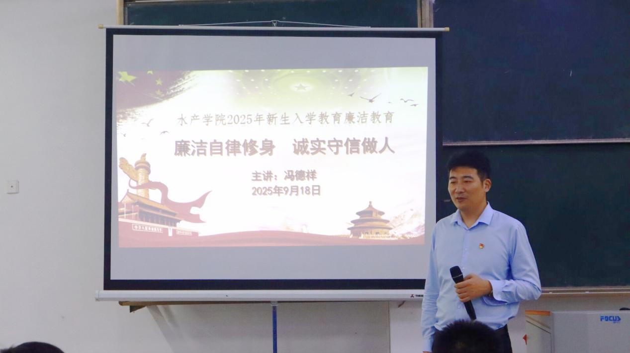 冯德祥首先从廉洁的核心内涵出发,阐述了在新生中开展廉洁教育的重要意义。他结合水产专业特点,进一步讲解了中华优秀传统文化中崇廉尚俭的优良传统、校规校纪中有关廉洁行为的规范要求,以及贴近校园生活的实际案例,教育引导同学们自觉抵制享乐主义、攀比风气和学术不端等不良行为,鼓励大家从遵守课堂纪律、维护集体利益等日常小事做起,努力成长为品行端正、能担民族复兴大任的时代新人。最后,他号召全体新生,要不断提升专业素养和综合能力,锤炼自强不息的意志品质,在面对各类不良诱惑和风气时坚决说“不”。