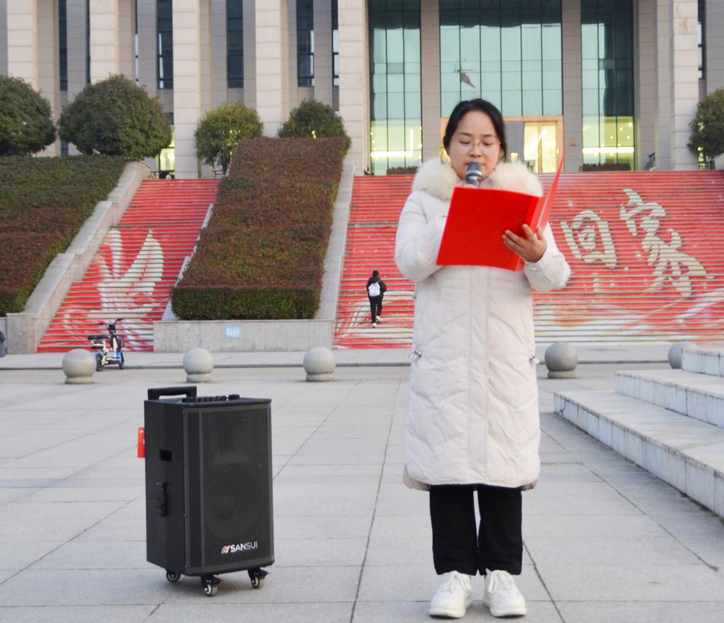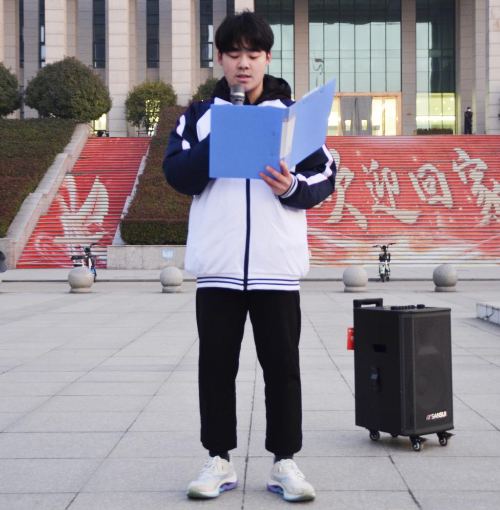 仪式在庄严的国歌声中拉开帷幕,全体师生肃立行注目礼,五星红旗冉冉升起。学生代表王世宇同学进行国旗下的演讲,团委副书记秦双飞作为教师代表发言。