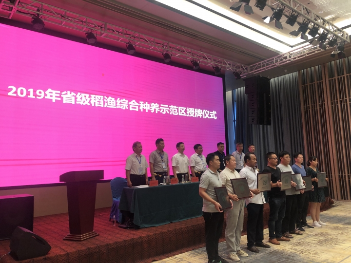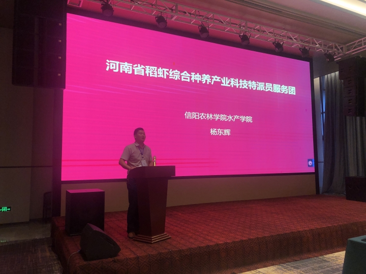 会上还为获得2019年省级稻渔综合种养示范区的企业举行了授牌仪式。会议的第二阶段,6位与会企业代表和相关专家分别发言,各企业代表进行了各自企业稻渔综合种养技术的介绍,河南省水产科学研究院研究员常东洲、河南省农科院粮作所研究员尹海庆分别就我省稻渔综合种养技术提升和稻渔产业增收增效进行了发言。水产学院院长、河南省稻虾综合种养服务团团长杨东辉教授也结合我省稻虾综合种养的情况,从稻米种植品种、品牌建设和创新养殖模式三方面为我省稻虾综合种养产业做出了合理化建议。最后,河南省水产科学研究院院长、“四优四化”优质水产品专项负责人李治勋进行了总结,我省稻渔综合种养还有较大的发展空间,要继续促进稻渔综合效益提升,助力产业扶贫和乡村振兴。