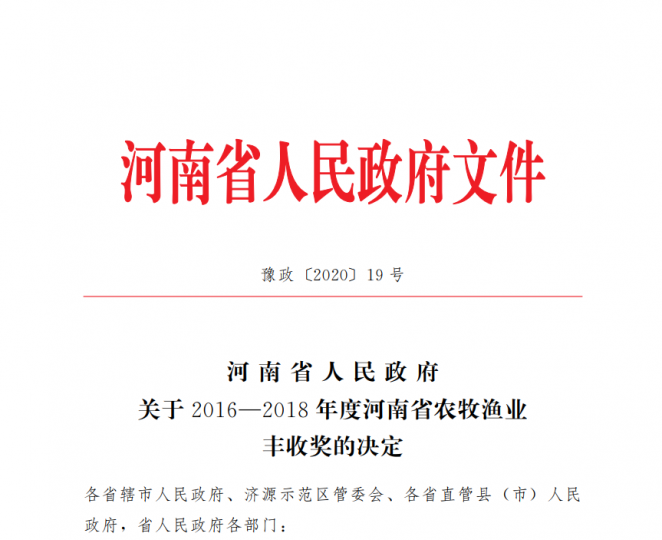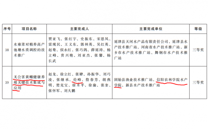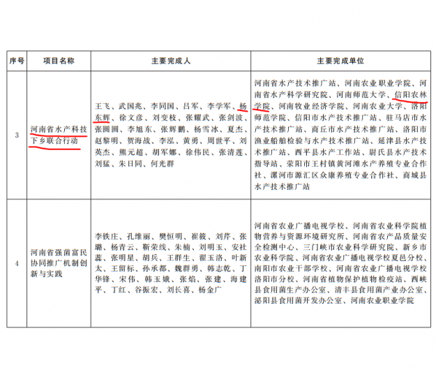 河南省人民政府公布的关于2016-2018年度河南省农牧渔业丰收奖的决定中,水产学院院长杨东辉参与的“河南省水产科技下乡联合行动”项目获合作奖,副院长伦峰参与的“无公害黄鳝健康养殖关键技术集成与应用”项目获成果奖三等奖。