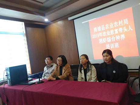 为提高商城县稻虾综合种养的品质与产量,切实增加养殖户的经济效益,10月27-30日,商城县农业技术推广站2019年致富带头人稻虾综合种养培训班在金刚台镇杜畈村益农信息社总社成功举办。河南省科技特派员服务队水产学院刘俊、黄荣静,生物与制药工程学院汪金萍受邀参加开班仪式并进行指导培训。县农业局党组成员、农监办副主任张兴文,商城县农业技术推广站站长卢旭东出席开班仪式并作重要讲话。参加本次培训班共35人,是商城县农业局精心挑选出来的稻虾种养的精英养殖户,可谓是致富带头人。本次培训分为理论学习和现场观摩两部分,刘俊老师从当前稻渔综合种养的现状、小龙虾养殖技术、水稻种植等几方面开展针对性技术培训;黄荣静老师详细讲解信阳市稻虾综合种养技术操作手册;汪金萍老师为学员解读了稻虾综合种养的相关扶持和补贴政策。此次培训致力于提高学员稻虾养殖理论技术水平,丰富实战经验,实现渔业增效、渔民增收。(刘俊)