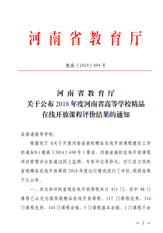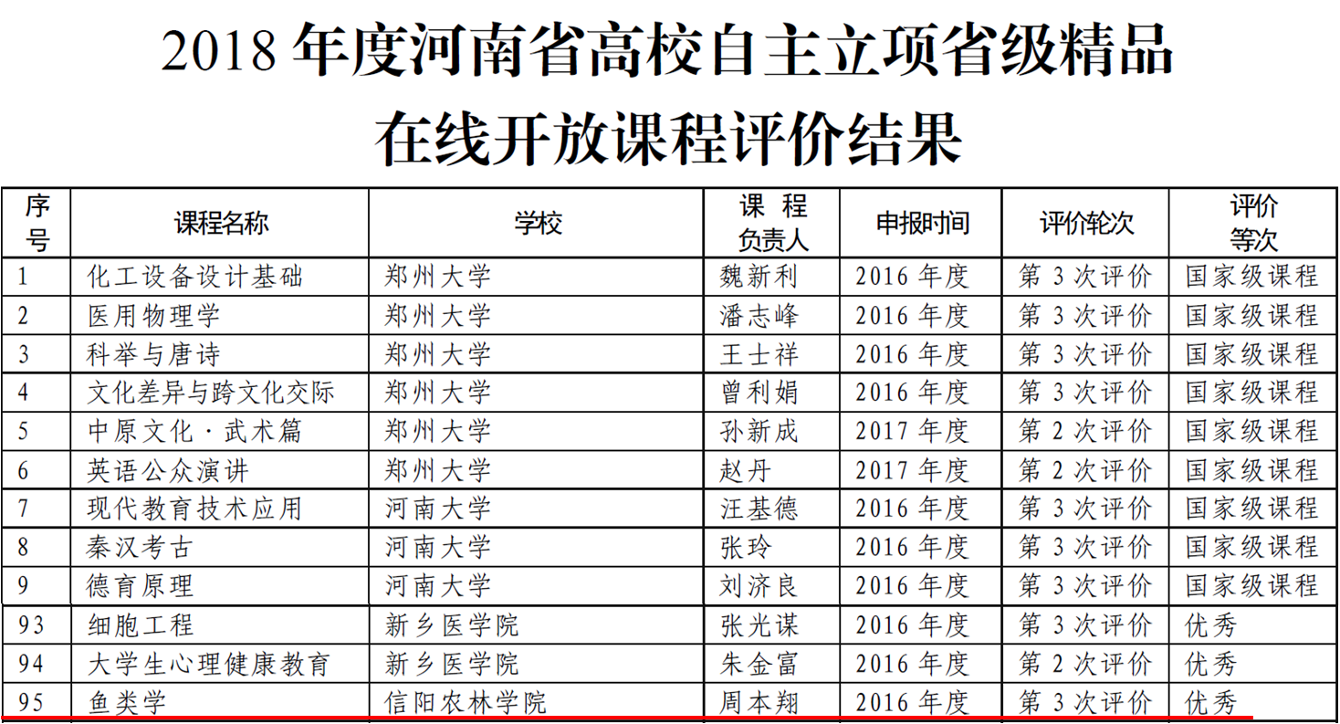 2019年7月24日,河南省高校在线开放课程项目管理办公室通过网上监测、专家评议等形式,对已经立项的省级精品在线开放课程2018年度运行情况进行了评价并予以公布,beat365在线平台官网《鱼类学》课程在第三轮评价中获得优秀。