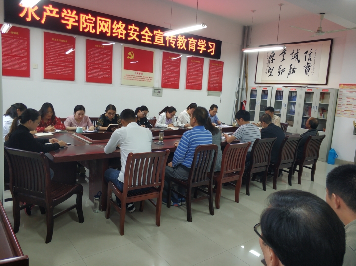 为深入学习贯彻习近平总书记关于网络强国的重要思想, 2019年9月17日下午,水产学院组织全体教职工在院会议室2C330开展网络安全宣传教育学习。会议由水产学院党总支书记郭旭升主持。