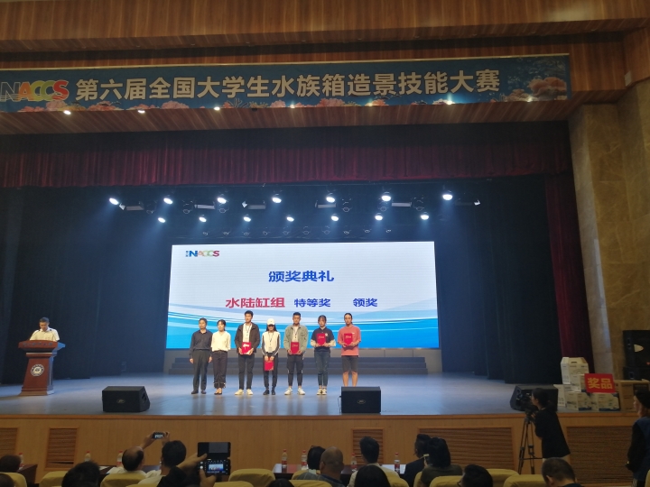 本次比赛共分为大型缸组、中型缸组、水陆缸组和微型缸组四个组别,我院派出了由3名指导教师和6名参赛同学组成的代表队参加了所有四个组别的比赛。比赛采用现场赛的形式,要求各组别学生利用赛事组委会提供的有限材料,在9个小时左右的时间内,完成骨架搭建、水草种植、设备安装调试等内容,并形成一个完整的水族造景作品。10月12日上午,比赛在浙江海洋大学长峙校区海科楼拉开战幕。经过一天的角逐,beat365在线平台官网代表队的四个参赛作品全部按时完成。13日上午,经过评委老师公正客观的评选,产生了本次比赛的特等奖、一等奖和二等奖等奖项。我院四个组别代表队全部获奖,其中特等奖1项、一等奖1项、二等奖2项。这是我院在去年第五届全国大学生水族箱造景技能大赛中取得一、二、三等奖各1项基础上的新突破。