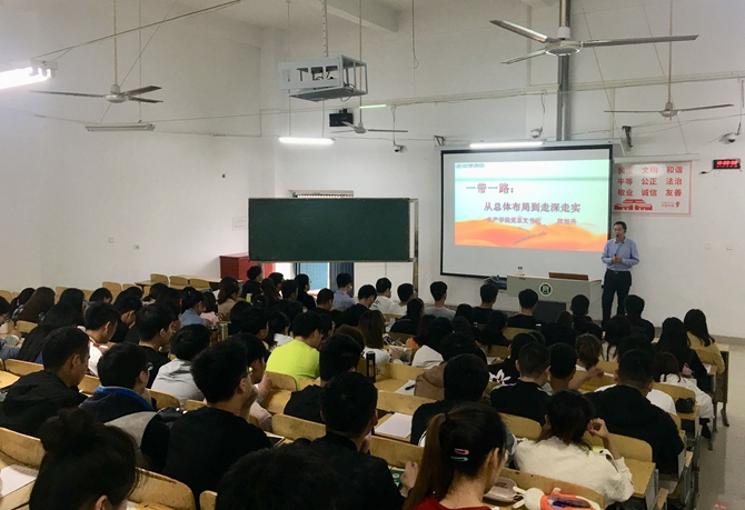 “一带一路”从理念转化为行动,连点成线到面,在广袤大陆上落地生根,在浩瀚海洋中乘风破浪。郭旭升从古代陆上与海上丝绸之路的历史背景引入,讲解了“一带一路”的时代背景、中国背景、战略目标和主体框架,千年丝路再次焕发出蓬勃生机,为当今世界开启发展新航程。他深入阐述了“一带一路”共商共建共享的核心要义,其建设行进在开拓和平、繁荣、开放、绿色、创新、文明之路的非凡征程中,孕育了生机和活力,汇聚了信心和期待。他着重论述了“一带一路”成果越做越多、人气越聚越旺的五年硕果,分析了其倡议深入人心的原因及走深走实的方向和重点任务。