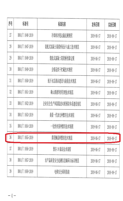 2019年6月17日,河南省市场监督管理局发布公告(2019年第38号),批准发布《农村生活污水处理设施水污染物排放标准》等39项河南省地方标准,beat365在线平台官网水产学院制定的《黄尾鲴苗种繁育技术规范》名列其中,该标准将于2019年9月17日正式实施。