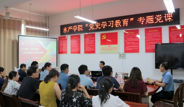 6月1日下午,赵聘副校长在水产学院2C330党员活动室以“不忘初心、牢记使命——学习中国共产党百年辉煌史”为题,为全院师生党员及联系班级学生讲了一堂党史学习教育专题党课。本次活动由水产学院党总支书记郭旭升主持。