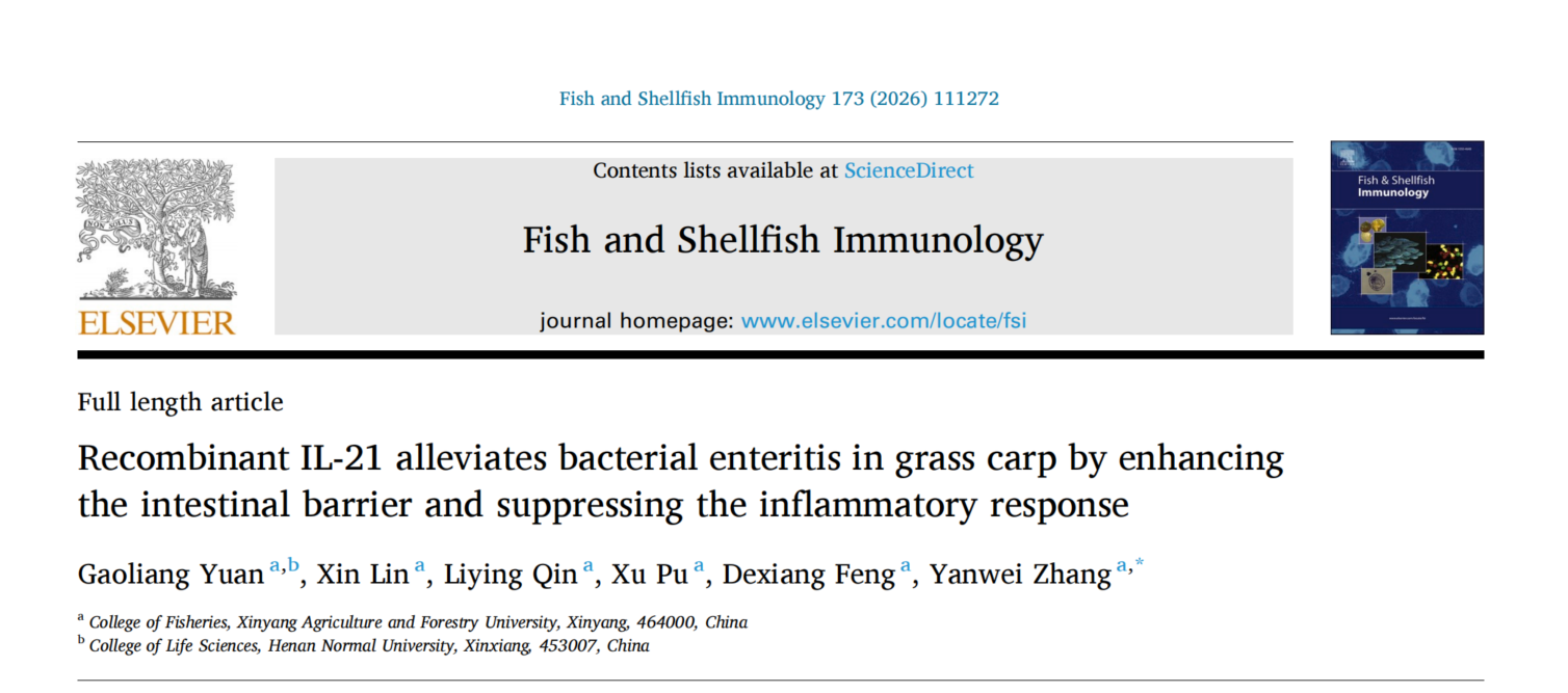 近日,我院水产学院水产动物营养健康与疫病防控团队在草鱼细菌性肠炎免疫防控方面取得新进展。相关研究成果以《Recombinant IL-21 alleviates bacterial enteritis in grass carp by enhancing the intestinal barrier and suppressing the inflammatory response》为题,发表在国际水产领域权威期刊《Fish and Shellfish Immunology》(JCR Q1,中科院二区Top期刊)。我院教师袁高亮为第一作者,张艳维为通讯作者。