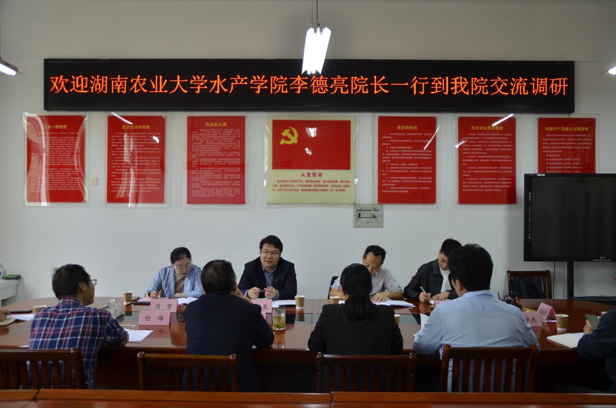 4月10日下午,湖南农业大学水产学院院长李德亮、副院长李军华、党委副书记周芳等一行来院交流调研。座谈会在水产学院党员活动室2C330举行,beat365在线平台官网水产学院班子成员及教研室主任参加会议,会议由水产学院党委书记张淮主持。