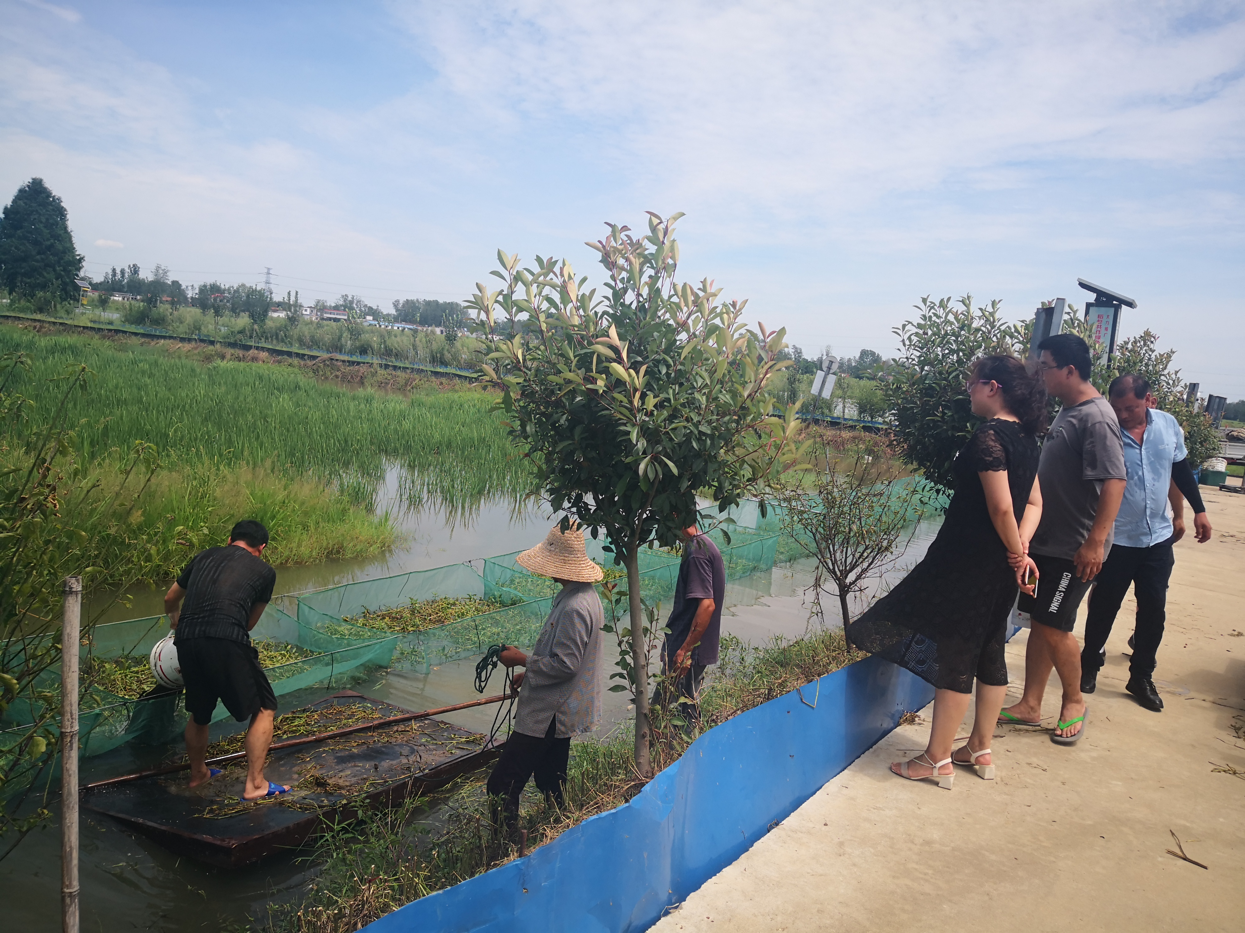 服务队实地查看了鑫海鳝鱼养殖专业合作社的黄鳝养殖基地,与企业负责人交流稻沟网箱布置设计、网箱养殖鳝鱼过程中如何应对应激反应、养殖管理等方面内容。随后,到明宇农业发展有限公司实地查看了稻虾基地,并对基地水质进行了取样。