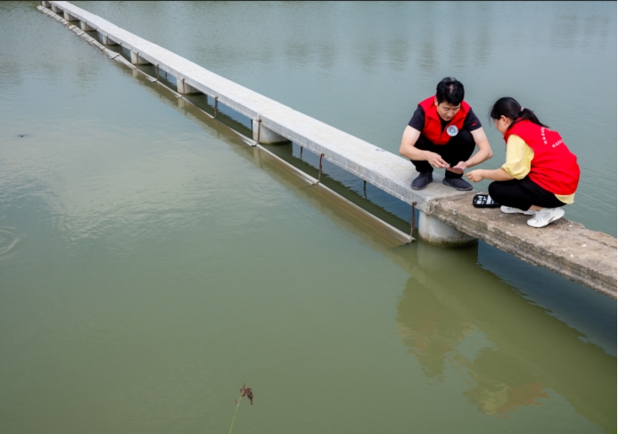 服务团成员黄荣静、冯德祥对中华鳖养殖池进行水质监测,指导中华鳖养殖池水环境变化、饲料投喂及管理等相关问题,为后续稻-虾-鳖模式的工作开展提供基础理论及技术支持。