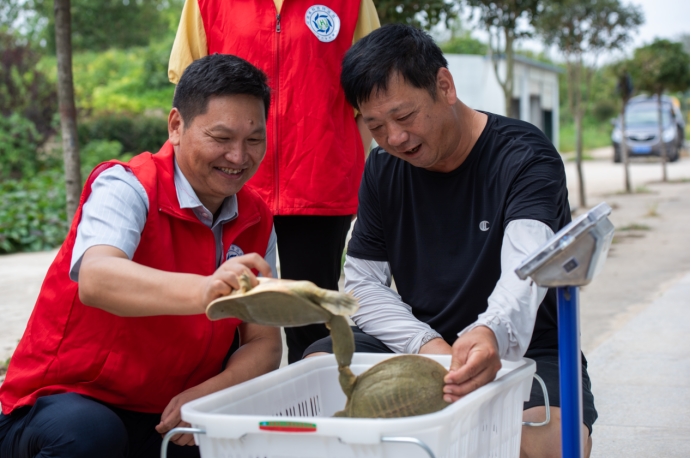 在潢川华来时代农牧科技有限公司的示范基地和乐建养殖种植专业合作社,杨东辉教授查看了投放的中华鳖养成情况,并对中华鳖进行打样称重。经过两个月的放养,中华鳖均增重已超过50%,并且体色肉质均已接近野生种群。