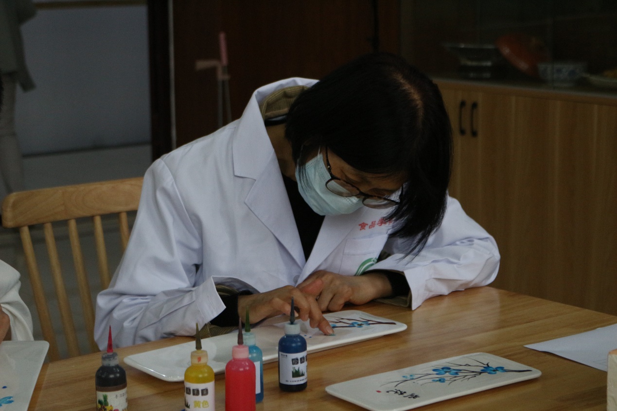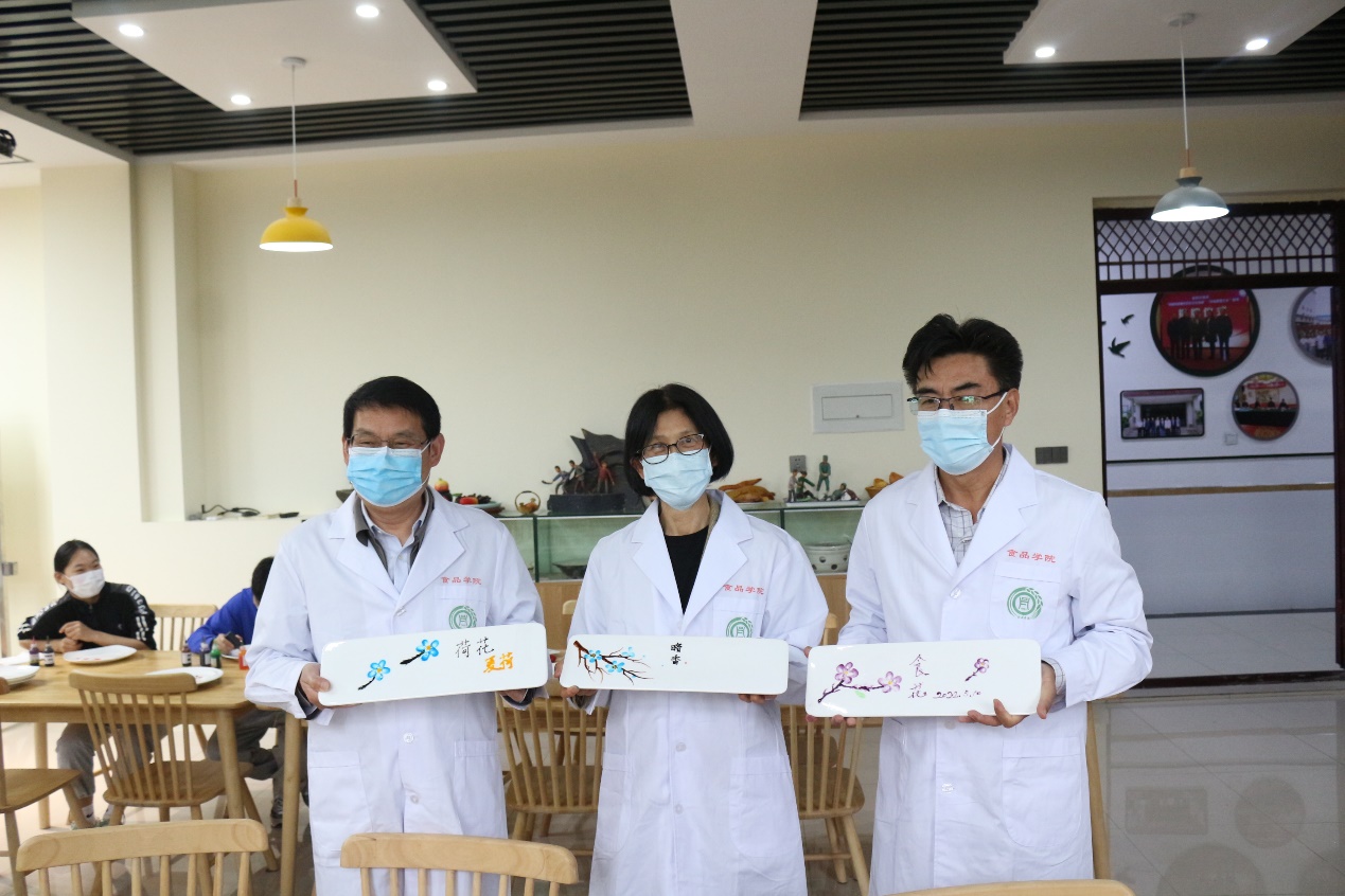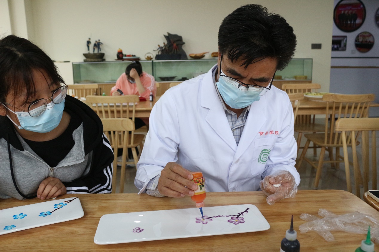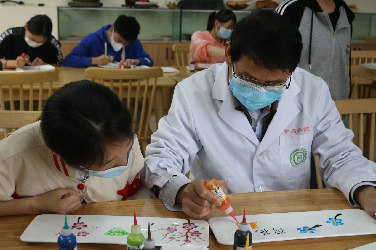 在信阳菜文化传承示范中心,校领导一行与“学生小老师”一起创作了名为“食花”、“夏荷”、“暗香”为主题的果酱画。校领导认真向“小导师”求教,学生被领导们认真求学的精神所鼓舞,大家都表示要利用大学时光,认真学习专业技能,为回报母校而努力奋斗。