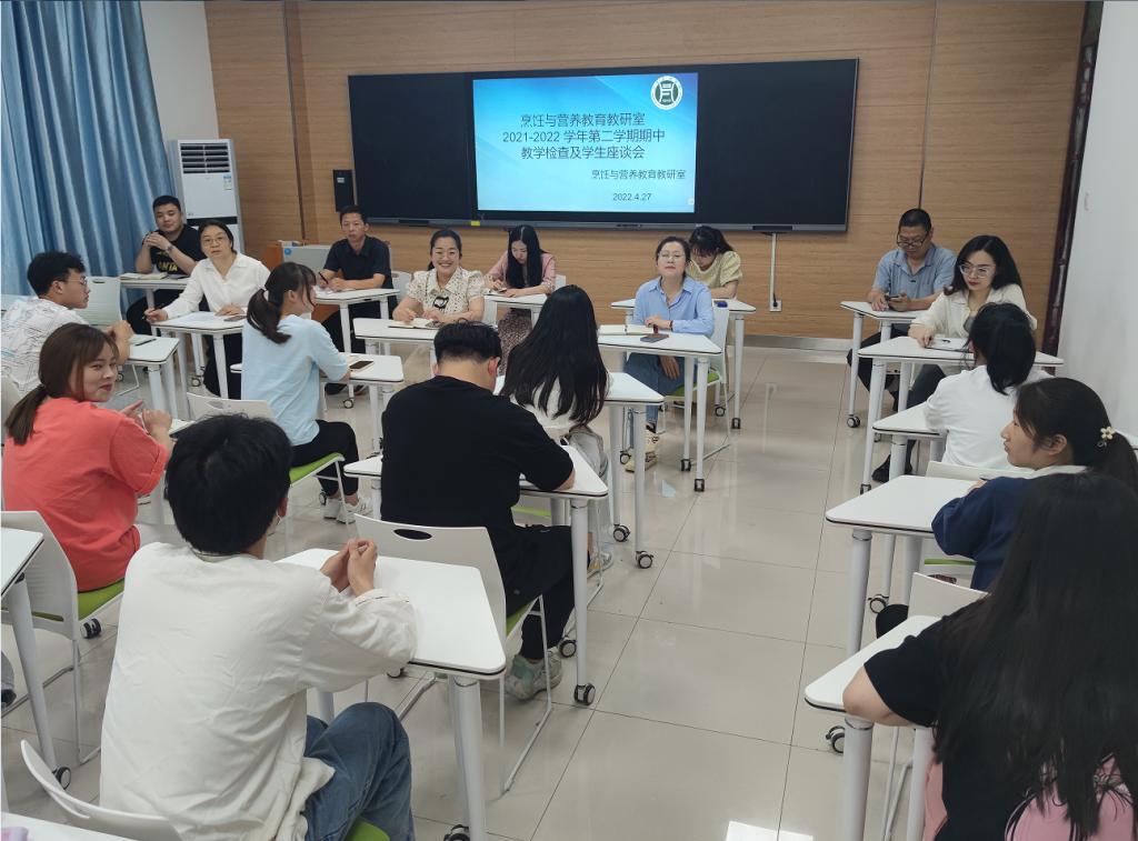 为加强教育教学过程监控,严格本科教育教学管理,及时发现和解决教学运行相关问题,根据学校《关于开展2021-2022学年第二学期本科期中教学检查的通知》、《食品学院关于开展2021-2022学年第二学期期中教学检查工作方案》的工作要求,食品学院各教研室相继召开了期中教学检查师生座谈会,全面了解学院本科教学运行情况,广泛听取意见和建议,及时发现并解决问题,保障学院教育教学质量的稳步提升。