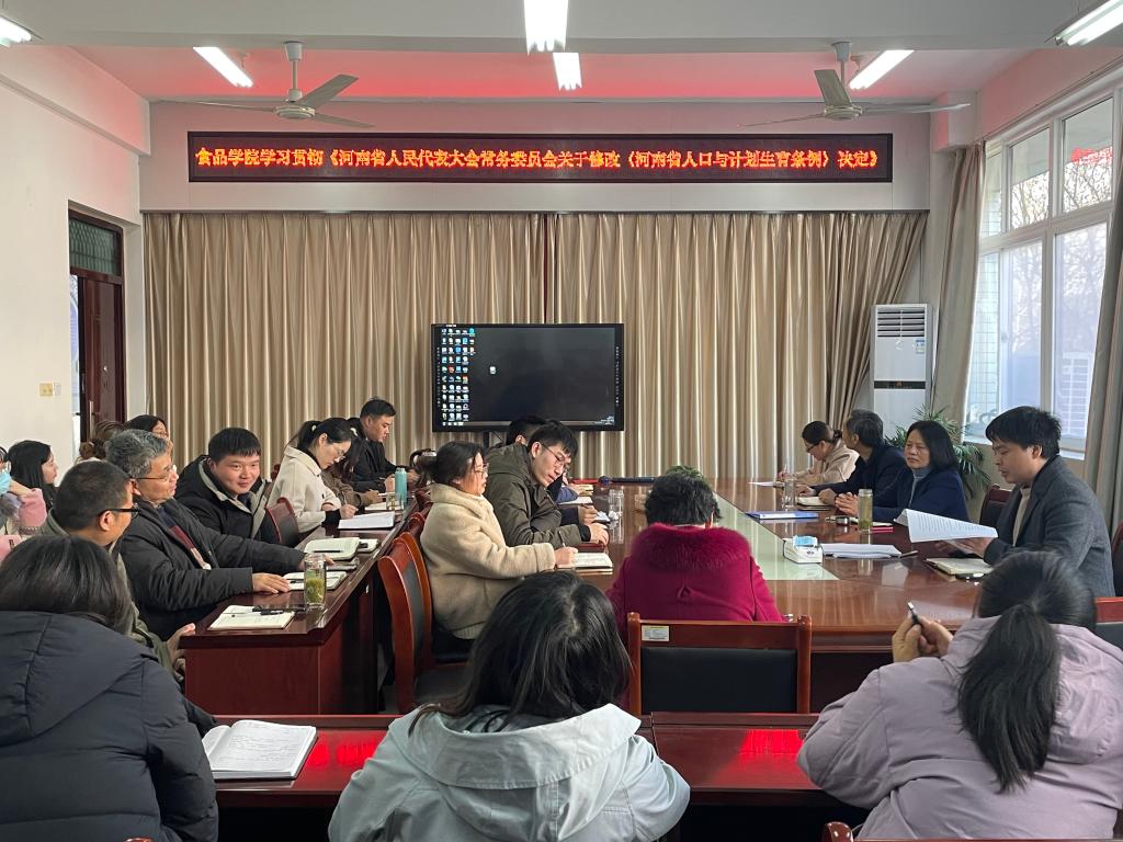 11月27日,河南省第十三届人民代表大会常务委员会第二十八次会议审议通过了关于修改《河南省人口与计划生育条例》决定,按照学校通知要求,12月21日下午,食品学院组织教师对《决定》的相关精神进行学习,学院全体教师参加会议。