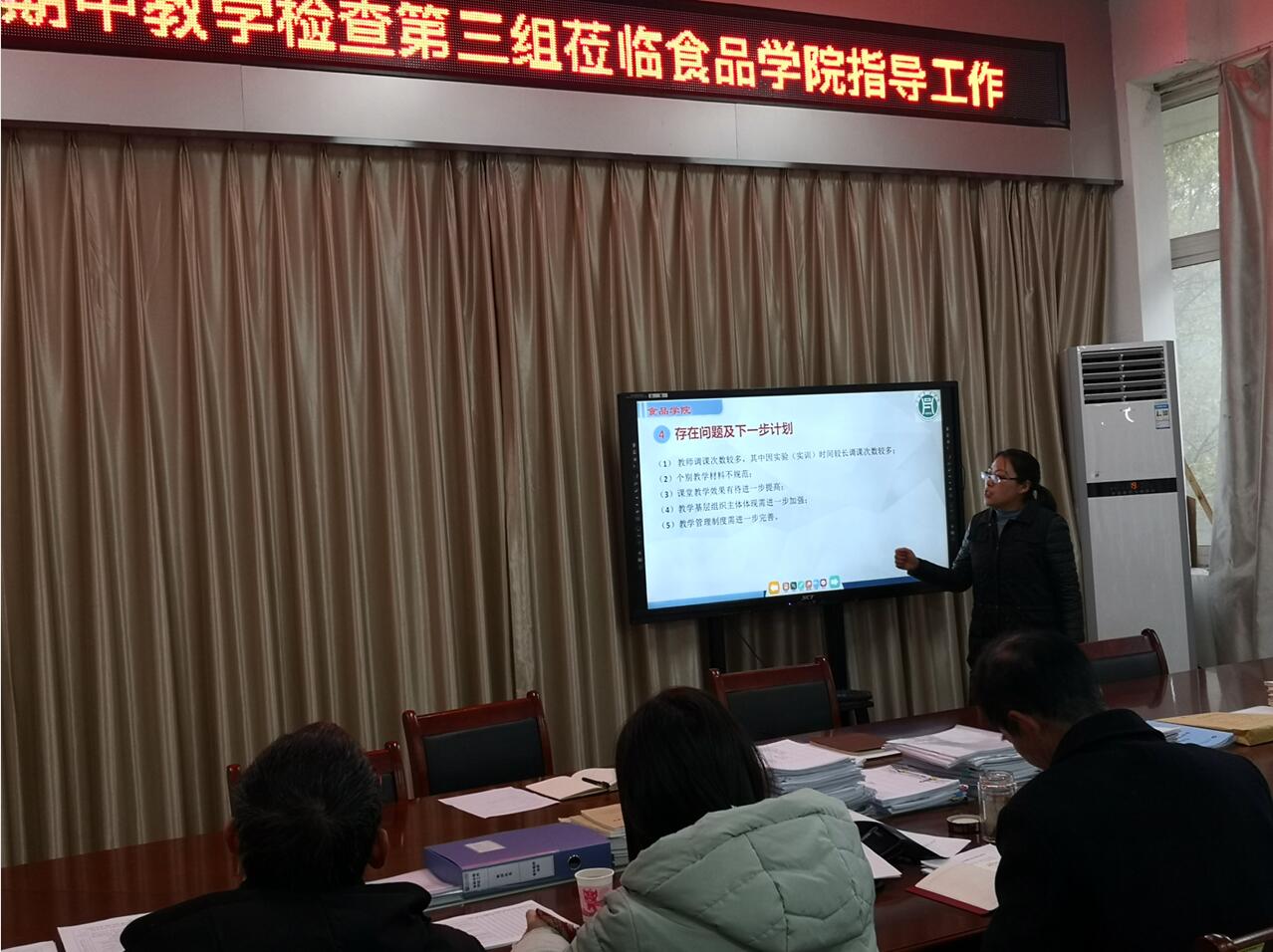 会上,邢院长对校级检查组的到来表示热烈欢迎,检查组的到来是帮助我们食品学院年轻教师成长和帮助我们食品学院在教学质量提高方面起到很大的促进作用,并请检查组成员对我院督导检查认真负责,不护短,不绕弯,直面问题,实事求是,为食品学院后期迎接本科教学工作审核评估打下坚实的基础。李建芳副院长从学院在本学期教学工作中专业教师承担教学任务的统计情况;院教学督导组对本科教学工作以及教学效果的检查督导情况;院本科教学整体教学档案的收集归档;课堂效果调研发现的问题及改进措施等各项工作进行了系统的汇报。