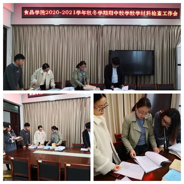为进一步加强教学档案材料建设,提升教学规范管理水平,按照食品学院期中教学工作安排,2020年11月11日下午食品学院期中教学检查领导小组与各教研室教师代表在1B206对本学期开始课程教师基本教学资料进行检查,检查内容包括任课教师本学期承担课程的理论课程教学大纲;实践教学大纲、课程考核大纲以及教学进度(日历)表、实践教学计划、实验教学计划任务书、教案(讲义)、课件、点名册、课堂考勤及记载表等教学材料。