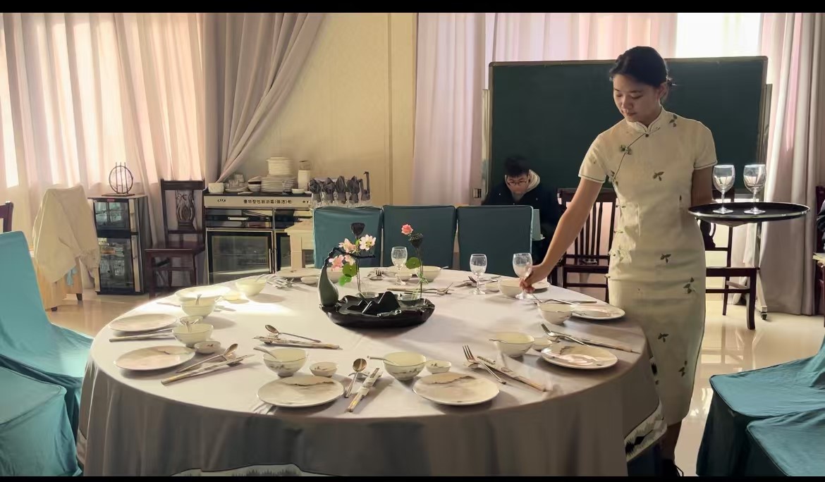 实训伊始,任课教师王宝刚和陈秋怡深入浅出地讲解了餐饮服务的精髓要义,从摆台的精准对称到上菜顺序的巧妙安排,每一个细节都融入了服务的艺术与文化。学生们在模拟餐厅中全情投入,他们身着整齐的制服,面带微笑,用优雅的姿态和礼貌的用语迎接“虚拟顾客”,力求将每一次服务都做到尽善尽美,充分展现出专业的服务态度和应变能力。