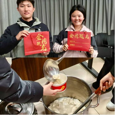 活动现场,学院领导与教师全程陪伴,与学生一同品尝象征“一举高‘中’”的热饺,并为学子送上寓意“金榜题名”的暖心福袋。腾起的热气与温暖的祝福交织成动人画面,传递着学院对考研学生的深切关怀。学子们手持福袋合影,青春笑容与烫金字样相映成景,成为冬日最具力量的瞬间。