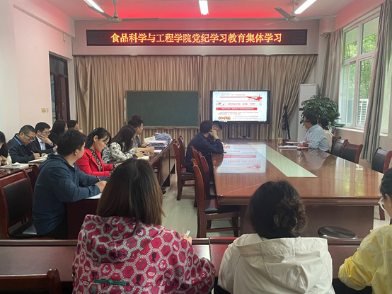 4月29日上午,食品科学与工程学院开展党纪学习教育集体学习,学院领导班子、全体党员参加会议。会议由学院党总支书记李海祺主持。