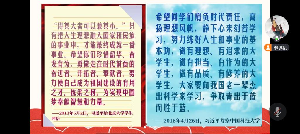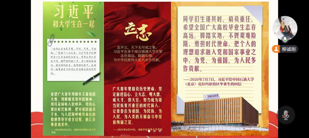 首先,支部书记柳诚刚与支部成员共同学习了习近平总书记给中国石油大学克拉玛依校区毕业生、莫斯科大学中国留学生和北京大学学生等的回信,并鼓励学生党员珍惜韶华、奋发有为,用实际行动践行青春使命,努力用智慧和汗水在新征程上建功立业。随后,全体党员一起观看了“温暖—习近平与大学生朋友们”微视频。会议最后,支部党员分别结合自己的学习和工作经历做了学习分享。