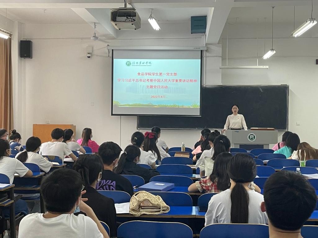 4月28日中午,食品学院学生第一党支部在一教A101组织开展学习习近平总书记在中国人民大学考察时的重要讲话精神主题党日活动。会议由党支部书记黄卉卉主持。