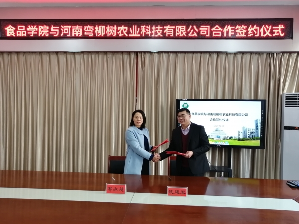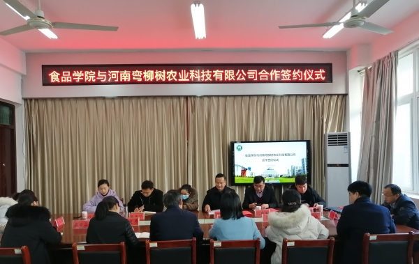 12月25日上午,息县科技局局长万保华、河南弯柳树农业科技有限公司董事长沈建军、总经理付金鹏、息县科技局办公室主任张倩、息县弯柳树村副支书张荣华、河南弯柳树商贸有限公司运营总监邱钰涵一行6人来到食品学院开展校企合作并签订框架协议。食品学院党总支书记夏新奎、院长邢淑婕、副院长邵颖、副院长李建芳、副书记刘涛及三位教研室主任参加了此次座谈与协议签署仪式。签约仪式由副院长邵颖主持。